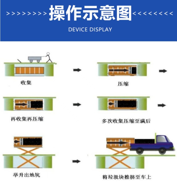 ◇平穩(wěn)可靠:兩側(cè)舉升,剪叉跨度大,升降平穩(wěn),無傾斜; ◇淺地坑:地坑深度僅為1.55m,保潔及維修極為方便; ◇高效率:壓實每噸垃圾時間≤10min; ◇全封閉水平壓縮:采用水平壓縮方式,垃圾壓縮密度≥0.86t/m3,垃圾壓縮后體積大大減小,從而大幅度提高轉(zhuǎn)運車輛裝載量和轉(zhuǎn)運效率,降低垃圾處理、轉(zhuǎn)運等費用; ◇動作少,故障率低,整套設(shè)備的垃圾壓縮、裝車由三個動作完成,簡單實用,各動作之間安全互鎖,防止操作人員誤操作造成安全事故,安全可靠; ◇垃圾儲存、壓縮及寄存全部在地面以下,地面上沒有垃圾散落,對環(huán)境影響較小,環(huán)保性好;垃圾壓縮后密度高,水份少,可避免汽車運輸中的垃圾散落、污水滴漏現(xiàn)象,避免二次污染; ◇土建費用低,占地面積小,可以不蓋大型工作間,既節(jié)約了投資,也縮短了工期; ◇留有專門的維修窗口,維修保養(yǎng)方便; ◇設(shè)有固定式操作和遙控器兩種操作模式,方便實用; ◇自動化程度高,可大幅提高工作效率,降低勞動強(qiáng)度。