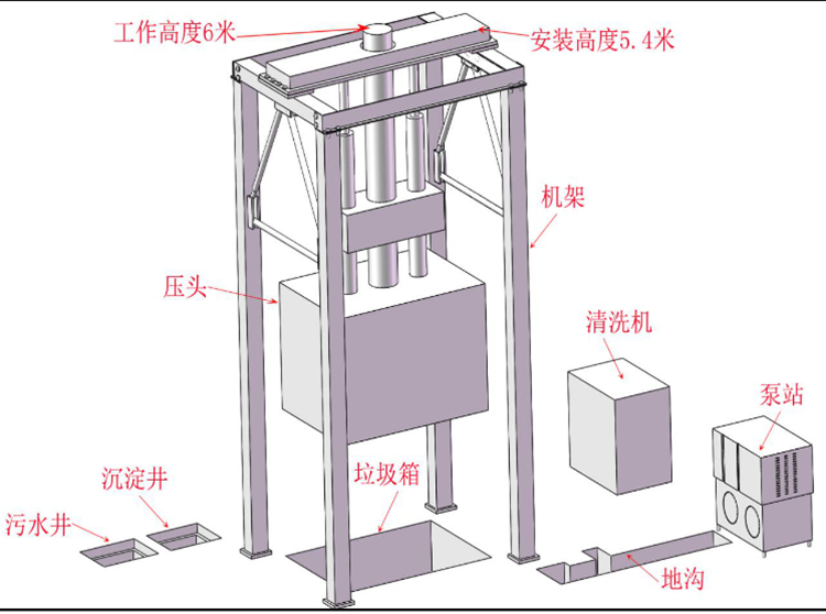 5)采用1條主壓縮油缸與2條副壓縮油缸并聯(lián)而成的壓縮油缸??商岣邏嚎s效率,降低設(shè)備高度,節(jié)約空間。